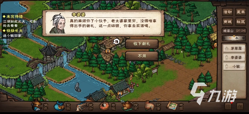 一有機(jī)會玩家就可以上前按住小敏,給小敏治傷,這里需要玩家提前準(zhǔn)備跌打藥,然后玩家就可以獲得閱歷*2000。接著玩家可以直接送小敏回家,目的地就是龍池村李婆婆所在地。到達(dá)小敏家玩家回合老少吃飯,吃完后進(jìn)行對話玩家此時,選擇不用獲得30體力,選擇收下謝禮獲得500文銅錢和30體力。
