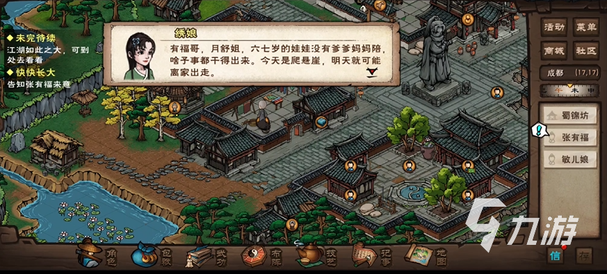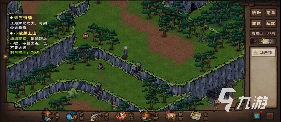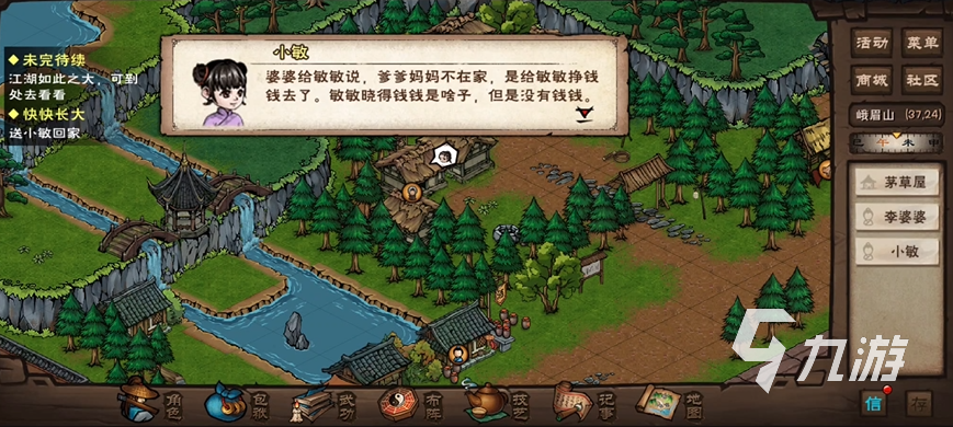 玩家可以先去峨眉山找到吳有為,和其打聽小敏的相關(guān)事宜,找到小敏打聽爹爹媽媽。接著玩家需要繼續(xù)在峨眉山找李婆婆閑聊,然后玩家會得知小敏有些許異常,這時在對話框里選擇應(yīng)下此事。玩家在睡一覺后走去村口跟蹤小敏,這里小編提前把躲藏的位置告訴大家,分別是村口、馬車內(nèi)、小敏左側(cè)樹林、草叢。