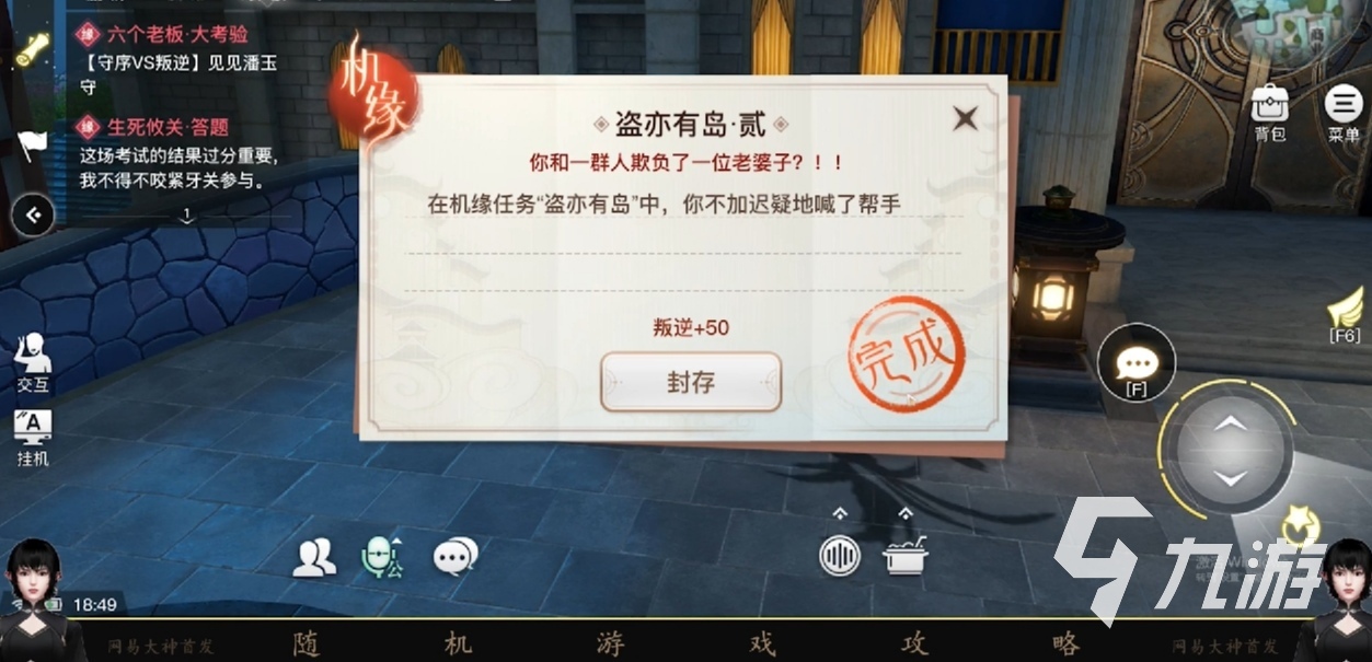到達到相關的出發(fā)條件之后,玩家就可以去完成機緣任務了,再完成這個任務的時候,首先玩家需要去領取任務,玩家需要在守衛(wèi)長那里領到緝拿盜圣的委托,然后在潘玉守那里拼圖得到盜圣的線索,根據(jù)線索的提示,玩家可以猜測出,晚上去書齋梁先生屏風后尋找盜圣,等到監(jiān)圣出現(xiàn)之后,玩家就可以選擇循規(guī)蹈矩的單挑,或者不按套路出牌的喊人圍毆他。