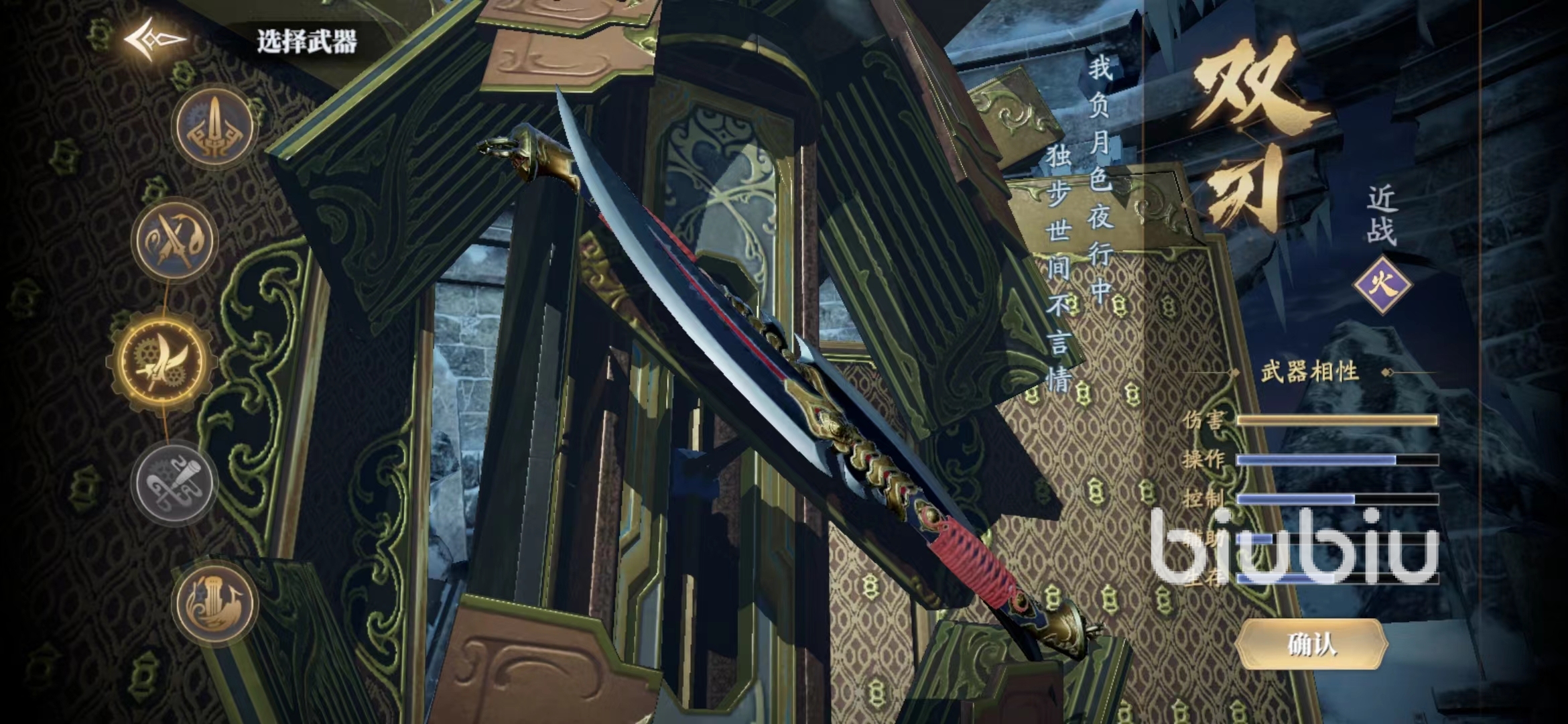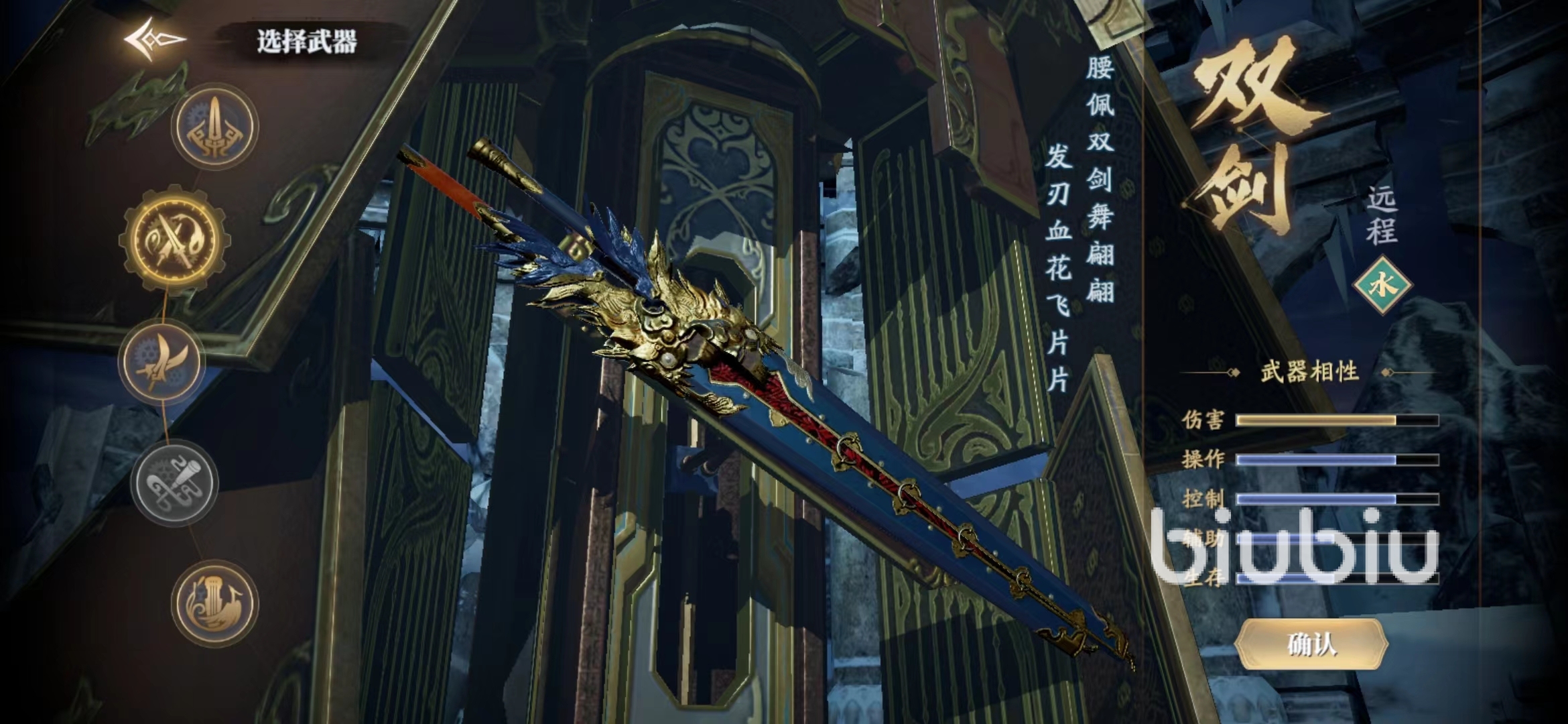單只劍是近戰(zhàn)武器的最好選擇,兩把劍組合在一起是遠(yuǎn)戰(zhàn)的不二之選,五行中屬水,傷害相較來說稍低一點(diǎn)但是彌補(bǔ)在控制度上,屬性明確與以上不一樣。