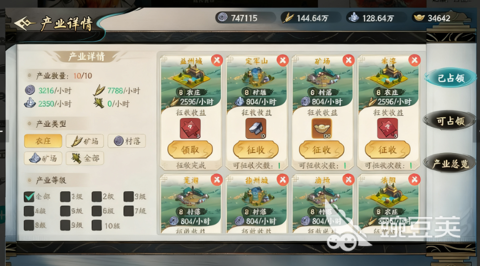 每個(gè)人都可以占領(lǐng)10個(gè)產(chǎn)業(yè),分別包括農(nóng)莊,村落,牧場(chǎng),礦場(chǎng),各有1~10級(jí)。
