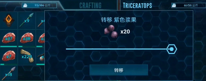 三角龍的馴服需要準(zhǔn)備的東西有:弓弩、麻醉箭、麻藥紫色漿果、黑色漿果、其他漿果。先在野外找一個野生的三角龍,等級大家自己判斷,最好是落單的三角龍。找到直接直接裝備上弓弩用麻醉箭射,放倒之后喂紫色漿果給它,一般幾十個就夠了。最好是喂食肉牛龍蛋,這是三角龍最喜歡的食物,但是前期還是比較難獲得的。當(dāng)然了,如果準(zhǔn)備了黑色漿果或者是麻藥也可以放進(jìn)去,增加眩暈度的。