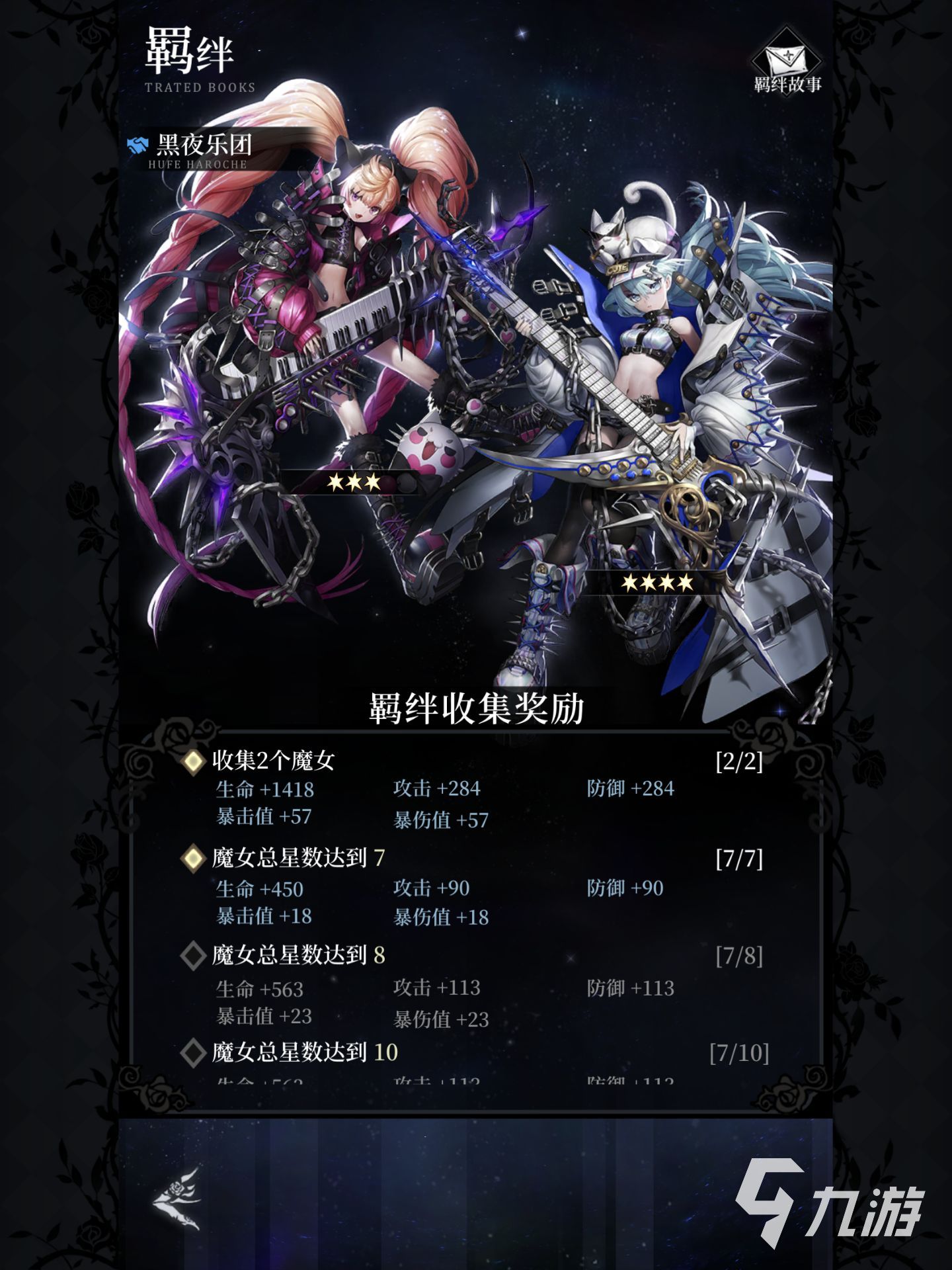由于場上戰(zhàn)斗的時(shí)候,只能上陣三個(gè)角色,所以優(yōu)先推薦組合人數(shù)比較少的羈絆,比如說黑夜樂團(tuán)米特拉和洛菲莉爾,她們兩個(gè)總星數(shù)達(dá)到八星之后,就可以增加生命值,攻擊力,防御值,暴擊概率以及爆傷,具體數(shù)值相當(dāng)于其他三個(gè)魔女或者是四個(gè)魔女組合出來羈絆的等量,所以完全沒必要湊其他的羈絆。