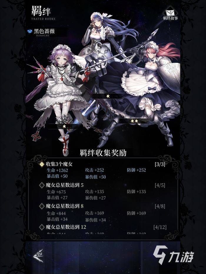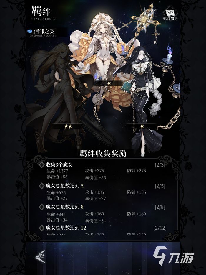 信仰之契:這個(gè)羈絆的魔女組成為卡琳娜,赫莎,黛西。三個(gè)人收集完成之后,增加的生命值比較高,其他的地方平平無奇,總星級達(dá)到18星之后,可以將近增加將近7000點(diǎn)生命值和兩千攻擊力。