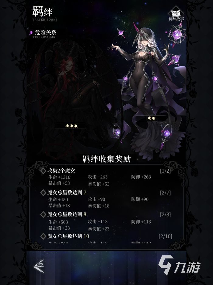 最后羈絆危險(xiǎn)關(guān)系:這個(gè)羈絆的組成只有兩個(gè)人,分別為瑪麗和麗莎,只要將他們兩個(gè)人收集完成之后,總星數(shù)達(dá)到12星,就可以將各種屬性強(qiáng)化到最大,她們兩個(gè)在羈絆故事中扮演著相愛相殺兩個(gè)主角,原本兩個(gè)好朋友卻因?yàn)椴煌年嚑I打破了平靜。