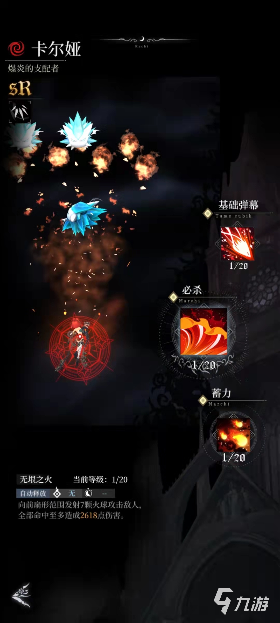 蓄力技能是無垠之火,效果是可以發(fā)射出一片扇形的火球,攻擊距離可以一直到屏幕的上方,全部擊中敵人可以造成高額傷害。從技能效果來看,卡爾婭屬于典型的輸出型魔女,雖然品級(jí)低一些,但是只要搭配一個(gè)治療,能夠打出的輸出并不低,前期用來推圖也是很合適的。