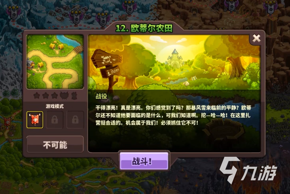 故事背景是維茲南的軍隊(duì)來到歐蒂爾農(nóng)田決定扎營,給歐蒂爾一個(gè)意想不到的奇襲,由玩家率領(lǐng)軍隊(duì)進(jìn)行征戰(zhàn)。該地形中敵人的出兵口較多,但跑圖通道只有一條,玩家在這一條通道上先建立起自己的防御陣型,優(yōu)先建立熔爐與死靈墓并升級,來抵擋前期的敵人;中期敵人數(shù)目增加后,熔爐點(diǎn)出滾燙碎石技能,配合死靈墓可以很好的抵御移速較快的看門狗。