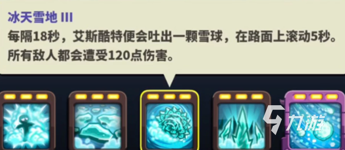 第三個技能叫冰天雪地,每隔18秒,可以突出雪球,持續(xù)5秒,滾動期間對敵人造成120點傷害。
