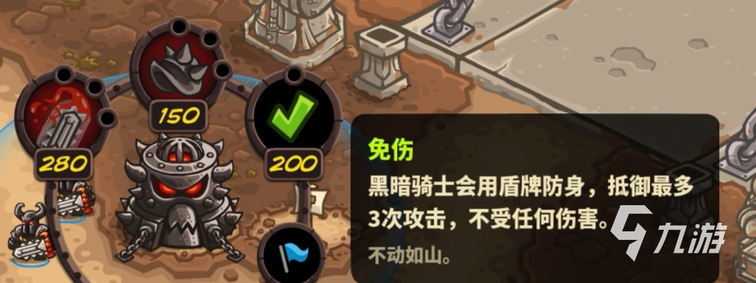 免傷這個技能給到黑暗騎士的強度是很高的,能夠使黑暗騎士抵御三次傷害,再加這個技能讓黑暗騎士在面對那些高爆發(fā)的敵人時擁有一個很好的壓制效果,為防御塔的進攻提供時間。小編推薦大家優(yōu)先去點這個技能,可以帶來很高的收益。