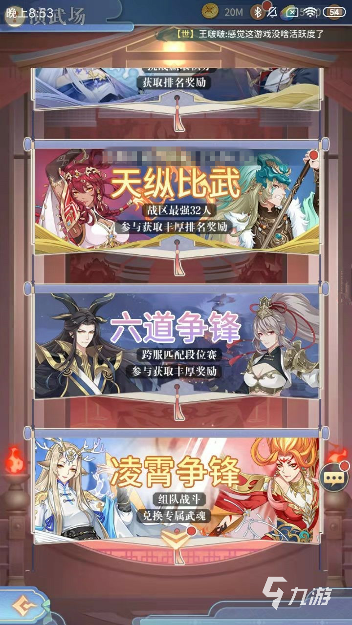 玩家進入游戲后可以通過主城中的演武場地點看到包括多種不同的活動,其中包括天縱比武活動,此活動分為三個賽段,預(yù)選賽,晉級賽和冠軍賽。