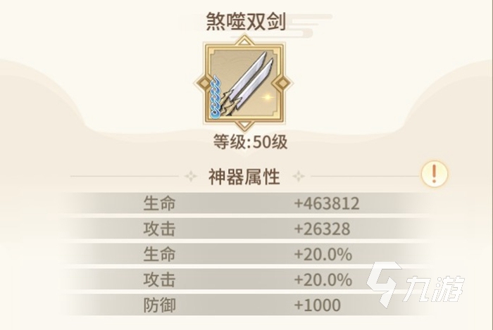 饕餮擁有自己的專屬武器煞噬雙劍,在升級到50級之后可以為饕餮增加462812點(diǎn)的生命值、26328點(diǎn)的攻擊力以及1000點(diǎn)的防御力加成,另外還可以給饕餮附加20%的生命值以及攻擊力加成。煞噬雙劍的神器技能可以讓饕餮在戰(zhàn)斗中增加10%的生命值以及攻擊力,另外,在饕餮給目標(biāo)施加回合印記之后增加36點(diǎn)的移速,在擊殺敵方之后還可以回復(fù)25點(diǎn)努力并且在場上敵人死亡之后隨機(jī)為剩下的一個(gè)敵人施加一層的回合印記。