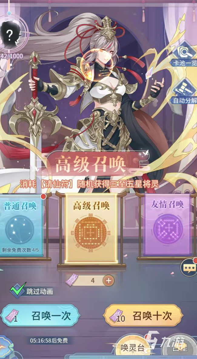 玩家進(jìn)入游戲界面,在左下角的主城里面找到喚靈臺(tái),進(jìn)入喚靈臺(tái)有普通召喚,高級(jí)召喚和友情召喚3個(gè)召喚功能,普通召喚有兩種方式,一種是免費(fèi)召喚,一共有5次免費(fèi)召喚的機(jī)會(huì),另一種是用10張祈靈符進(jìn)行十次召喚,高級(jí)召喚也是兩種召喚方式,一種是免費(fèi)召喚,下一次免費(fèi)召喚的機(jī)會(huì)會(huì)有時(shí)間限制的大概在5個(gè)半小時(shí)之后才可以進(jìn)行免費(fèi)召喚,另一種是用10張請(qǐng)仙符進(jìn)行十次召喚,如果玩家請(qǐng)仙符數(shù)量沒有達(dá)到10張還可以一次一次的進(jìn)行召喚,每次用仙符,友情召喚需要用到友情點(diǎn),10個(gè)友情點(diǎn)召喚一次,100個(gè)友情點(diǎn)可以召喚十次這兩種方式。