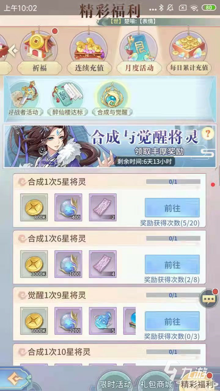 玩家在限時活動的精彩福利頁面中可以看到月度活動,包括好戰(zhàn)者活動,醉仙樓達標(biāo),合成與覺醒。在合成與覺醒中通過合成或者覺醒指定星級的將靈,即可獲得豐厚獎勵,可以反復(fù)完成任務(wù)并領(lǐng)取獎勵,直至次數(shù)上限。當(dāng)覺醒一次9星將靈或10星將靈后,可以在此活動中領(lǐng)取豐厚道具獎勵,其中包括補天玉道具。
