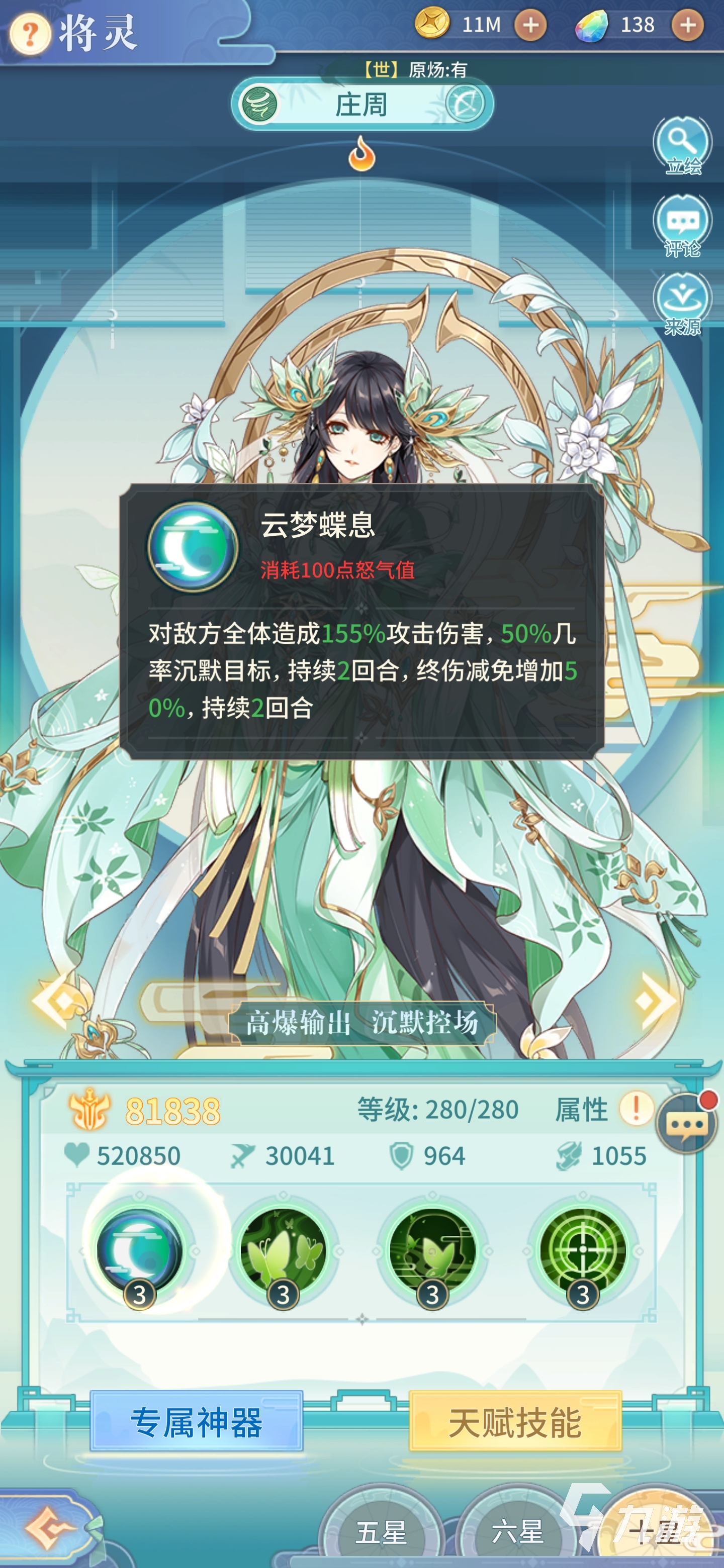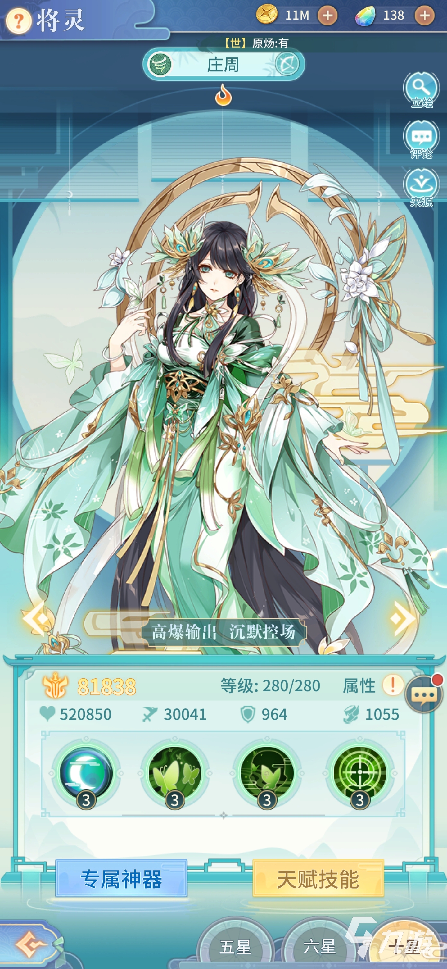 莊周是一個(gè)可以升為十星的輔助型角色,在這款戲中,十星的角色能夠開(kāi)啟天賦,這個(gè)角色在滿級(jí)的時(shí)候能達(dá)到81000戰(zhàn)斗力,如果加上裝備的話,破九萬(wàn)是不成問(wèn)題的,好裝備,能夠讓她破十萬(wàn)。