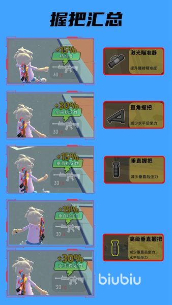 在目前的版本中,槍械的握把配件分為激光瞄準(zhǔn)器、直角握把、垂直握把以及高級垂直握把這四種握把組件,每一種握把組件都可以對武器帶有不同的提升效果哦。
