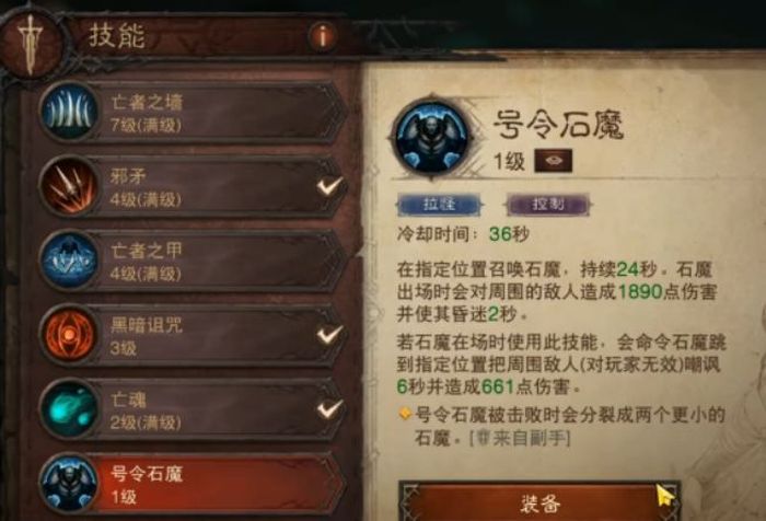 最后一個(gè)技能可以考慮使用石魔號(hào)令,這個(gè)召喚物坦度極高而且自帶控制,后期還可以搭配傳奇來提升持續(xù)傷害,可以幫助我們在被敵人圍攻的時(shí)候使用,可以迅速的逃脫。
