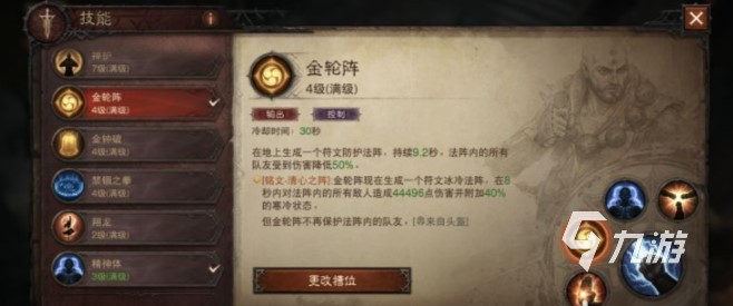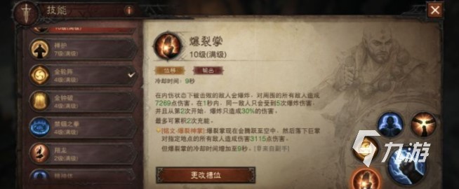 這里先放上Build,用爆裂掌+金輪陣+精神體+七相拳+雷光拳這么一套。這里爆裂拳是這個(gè)套BD的核心技,銘文自然也是對(duì)應(yīng)的神掌,給范圍敵人打印記,炸一次100%的傷害以及4次30%的傷害。我們?cè)谒D的時(shí)候自然是通過走位、以及金輪將怪拉到一起,這樣就能打出全額的傷害。這里需要注意一點(diǎn),在平常刷圖的時(shí)候,這個(gè)爆裂掌要避免快捷施法,以防只打到很小的范圍。該技能在打到空中的時(shí)候會(huì)有一小段的無敵幀,所以可以在打boss的靈活運(yùn)用。落地后會(huì)有微小硬直,這個(gè)倒是不用太擔(dān)心。