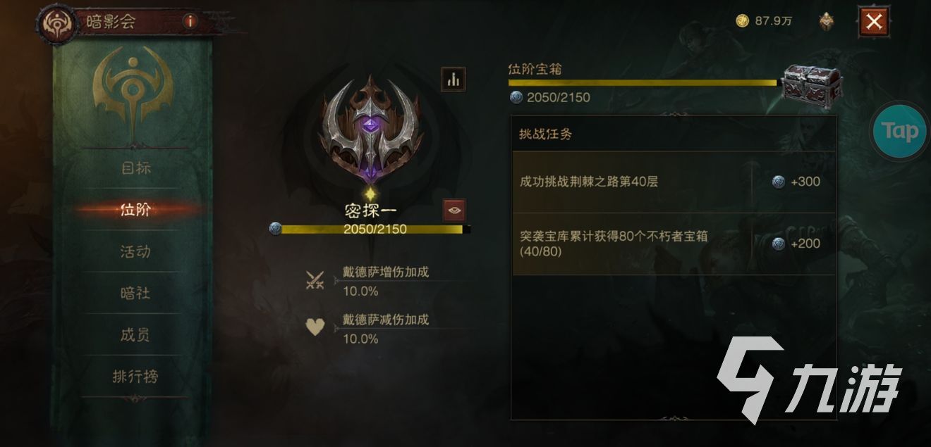其中,通過(guò)暗影會(huì)這個(gè)陣營(yíng),小伙伴們的主要任務(wù)就是積攢陣營(yíng)積分來(lái)完成最終的目標(biāo),同時(shí)可以得到一個(gè)位階印記,而這個(gè)位階是能夠不斷提高的;此外,小伙伴們也能和其他陣營(yíng)成員來(lái)組建暗社,通過(guò)排行榜也將可以看到前兩百名的暗社資料。