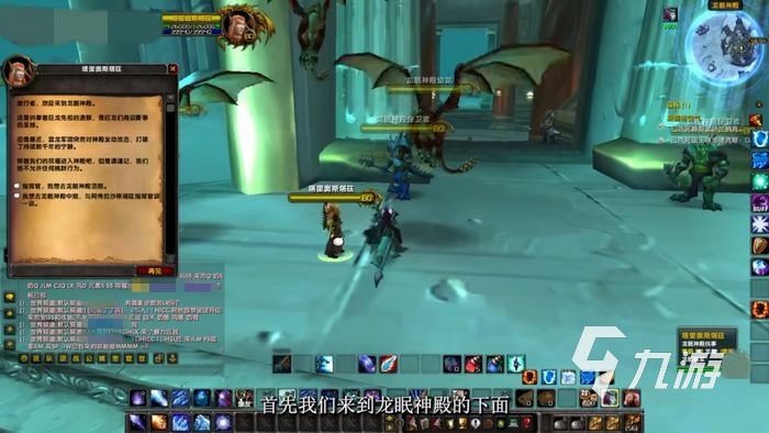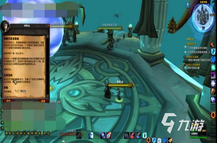 首先來到地圖龍眠神殿,該地方位于諾森德中間,是魔獸主要陣營的龍族聚集地,先在塔下的如圖的位置找到npc接取聲望開啟的任務,然后前往塔頂找三個龍族代表。
