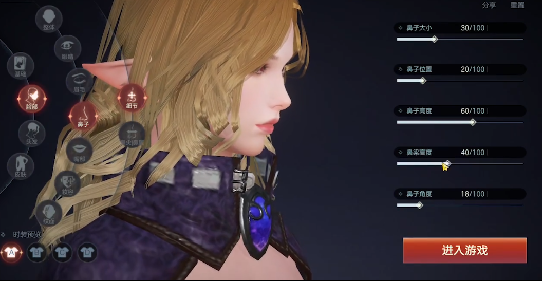 其次是臉型,大家可以對角色的鼻子、眼睛、眉毛、嘴部、妝容、紋面、耳朵、下巴和面頰等部位進行不同的調(diào)整,在調(diào)整期間,大家可以選擇其中的任意一個部位,然后點擊進入以后就會有很多不同的選項,這個時候大家只需要根據(jù)自身的需求和喜好進行調(diào)整就可以了。