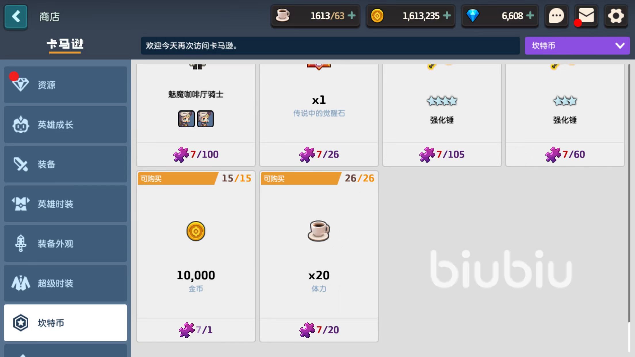 當(dāng)在活動(dòng)中所獲得的道具不斷增多后,還可以通過道具在商店中兌換各種不同的商品,比如通過消耗20個(gè)坎特幣可以獲得20點(diǎn)體力值,通過消耗不同數(shù)量的坎特幣可以購買多種商品道具。