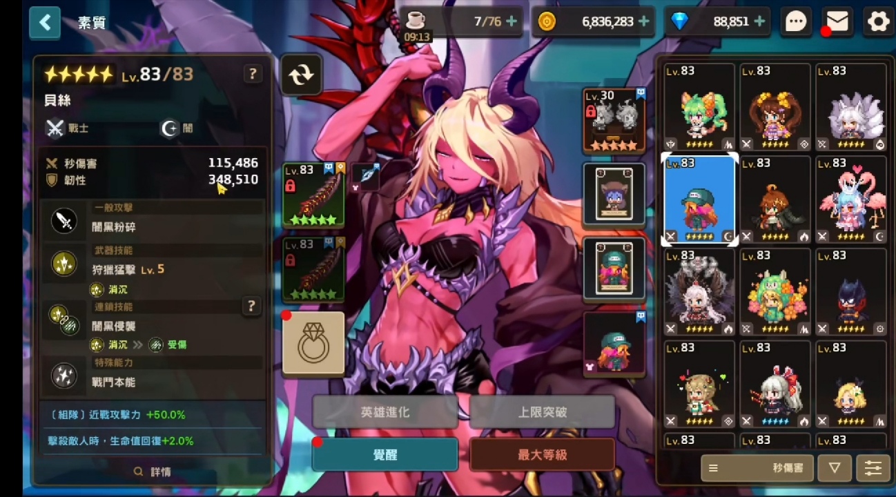 作為一個暗屬性的戰(zhàn)士,他的裝備是手里劍,普通攻擊叫做暗黑粉碎,可以將自身的魔力注入到他的裝備,雙手劍當(dāng)中,給敵方帶來傷害,他的連鎖技能叫做暗黑侵襲,凝聚魔力能夠造成400%DPS范圍傷害,并使近戰(zhàn)攻擊力提升40%,持續(xù)8s。而他的特殊能力滿進(jìn)化之后,會覺醒他的戰(zhàn)斗本能,根據(jù)三格內(nèi)敵人的數(shù)量攻擊力提升15%~60%,并且減傷15%~60%,近戰(zhàn)能力可以說是相當(dāng)?shù)目植溃梢詫⑵渥鳛閼?zhàn)場上的主力進(jìn)行輸出,而其他角色需要做的就是增加它的暴擊率,為他抵擋更多的傷害,所以上面那個陣容是最合適的。