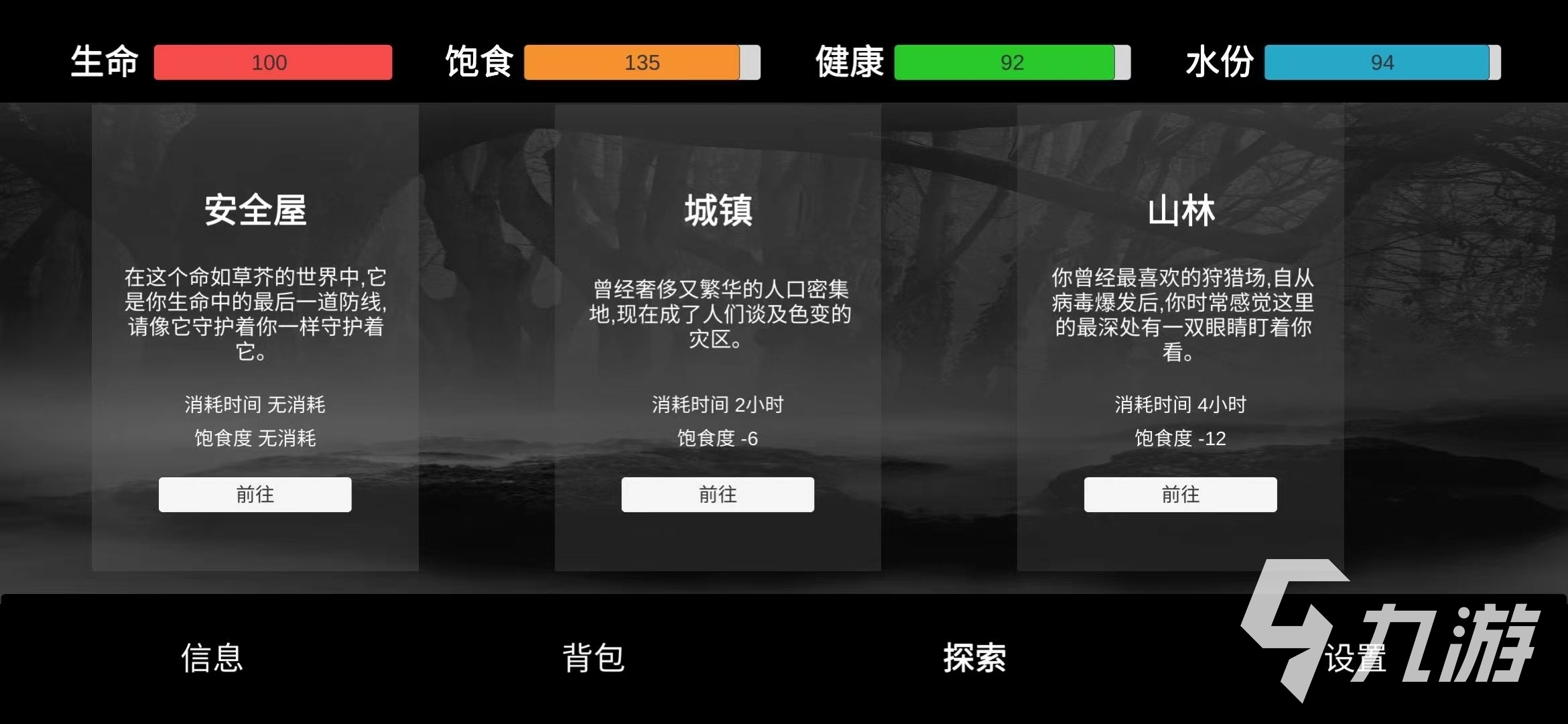 這是一款文字類(lèi)探索游戲,游戲內(nèi)會(huì)讓你選擇自己的天賦,一定要仔細(xì)選擇,因?yàn)檫@可能會(huì)關(guān)系到你的生死存亡,要時(shí)刻關(guān)注你的飽食度和健康值,一旦下降就會(huì)對(duì)你人物疊加負(fù)面狀態(tài),很多人連第三天都活不到,非??简?yàn)生存能力。