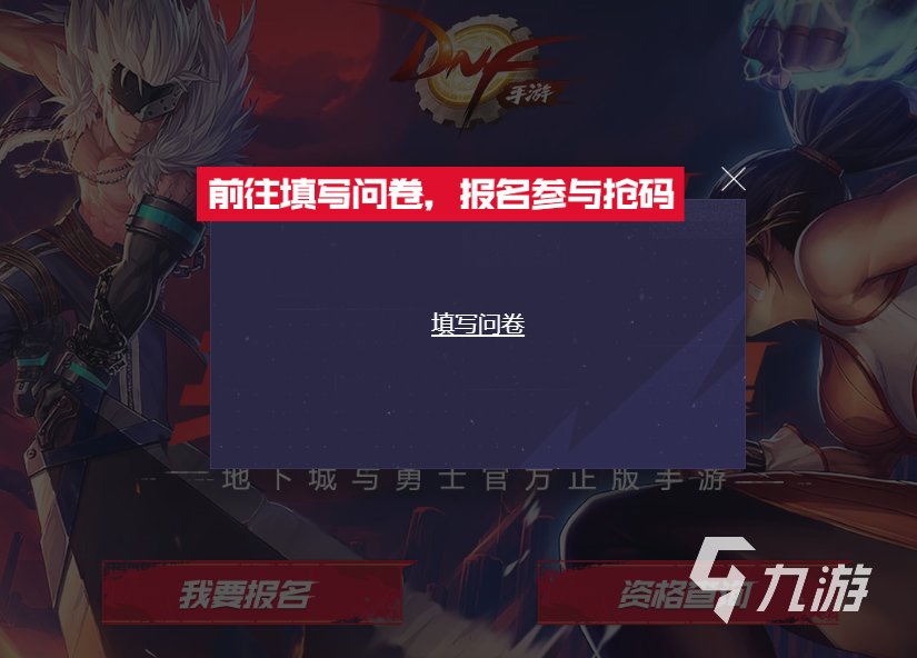 首先大家要去到九游官網(wǎng)找到地下城與勇士手游,在進(jìn)入到手游的頁面以后,點(diǎn)擊測試服資格申請,這個(gè)時(shí)候大家就需要去填寫一個(gè)調(diào)查問卷了,在填寫了調(diào)查問卷以后,過一段時(shí)間大家在到九游官網(wǎng)的這個(gè)頁面里面去查看是否有被抽中就可以了。