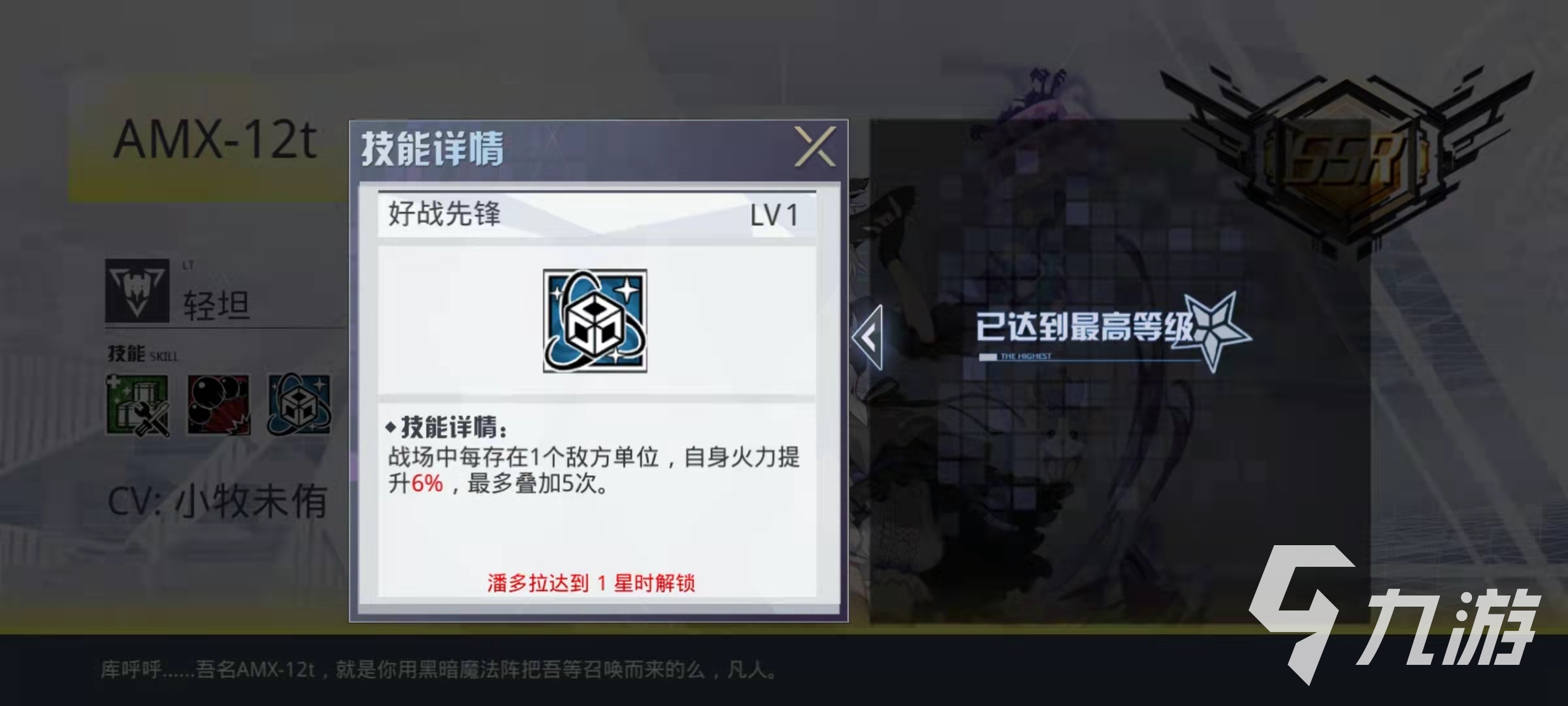 技能好戰(zhàn)先鋒的效果是當前戰(zhàn)斗中,敵方存在的數(shù)量每多一個,自身的火力輸出就可以提升百分之六,最多可以疊加到五層。這樣在開戰(zhàn)的時候,AMX-12t的輸出就可以達到最大值,這樣非常適合競技戰(zhàn)斗。當敵方有單位被擊殺的時候,AMX-12t就可以增加2.5點怒氣值,所以怒氣的恢復速度慢一些。