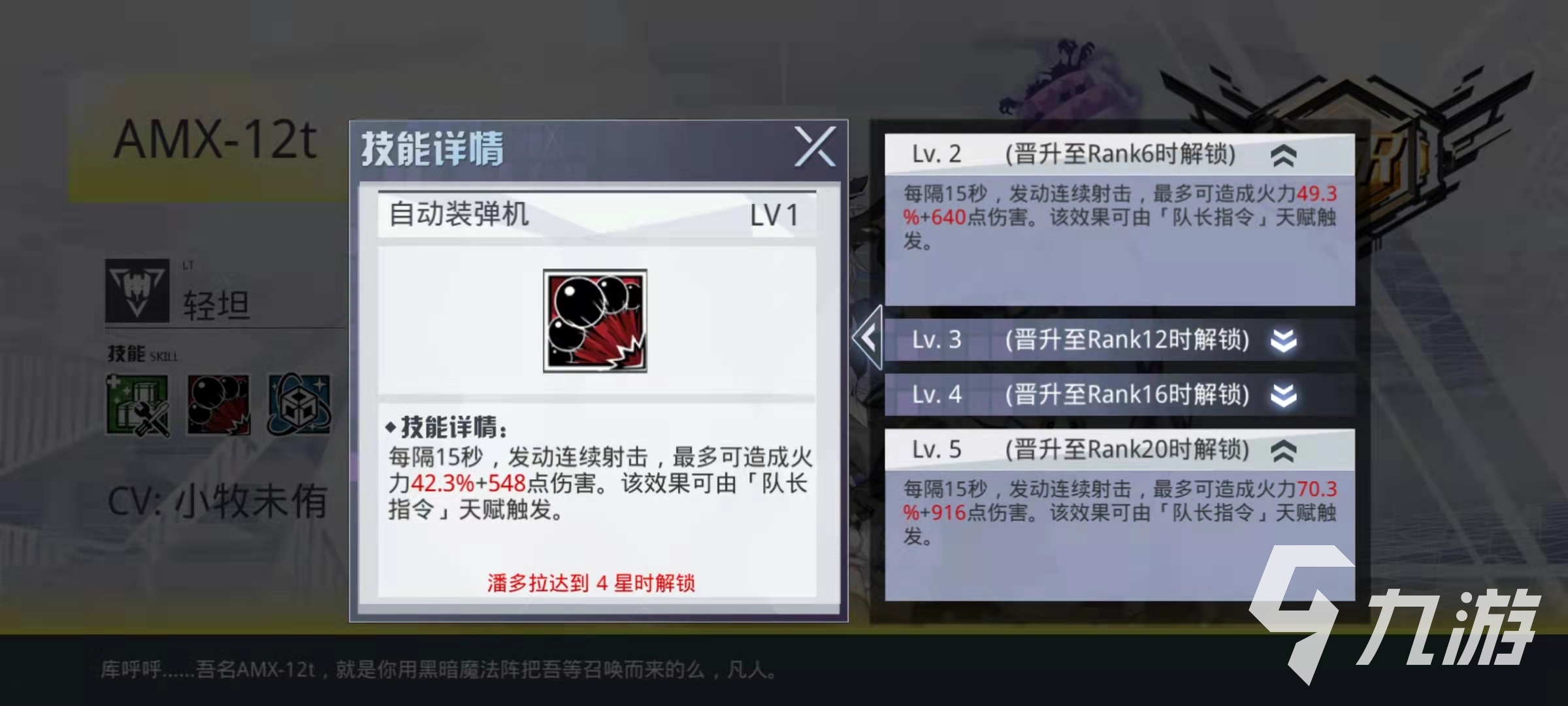 AMX-12t技能的恢復效果和自身的火力值相關,在治療生效之后,還可以為所有治療目標提升耐久值,也就是提升了最大生命值。AMX-12t屬于輔助型的角色,這里就很好的提升了整體隊伍的續(xù)航能力。技能自動裝彈機的效果是每間隔十五秒中,就可以發(fā)動一次連續(xù)射擊,可以造成不錯的火力傷害,也算是有了一些傷害的能力。