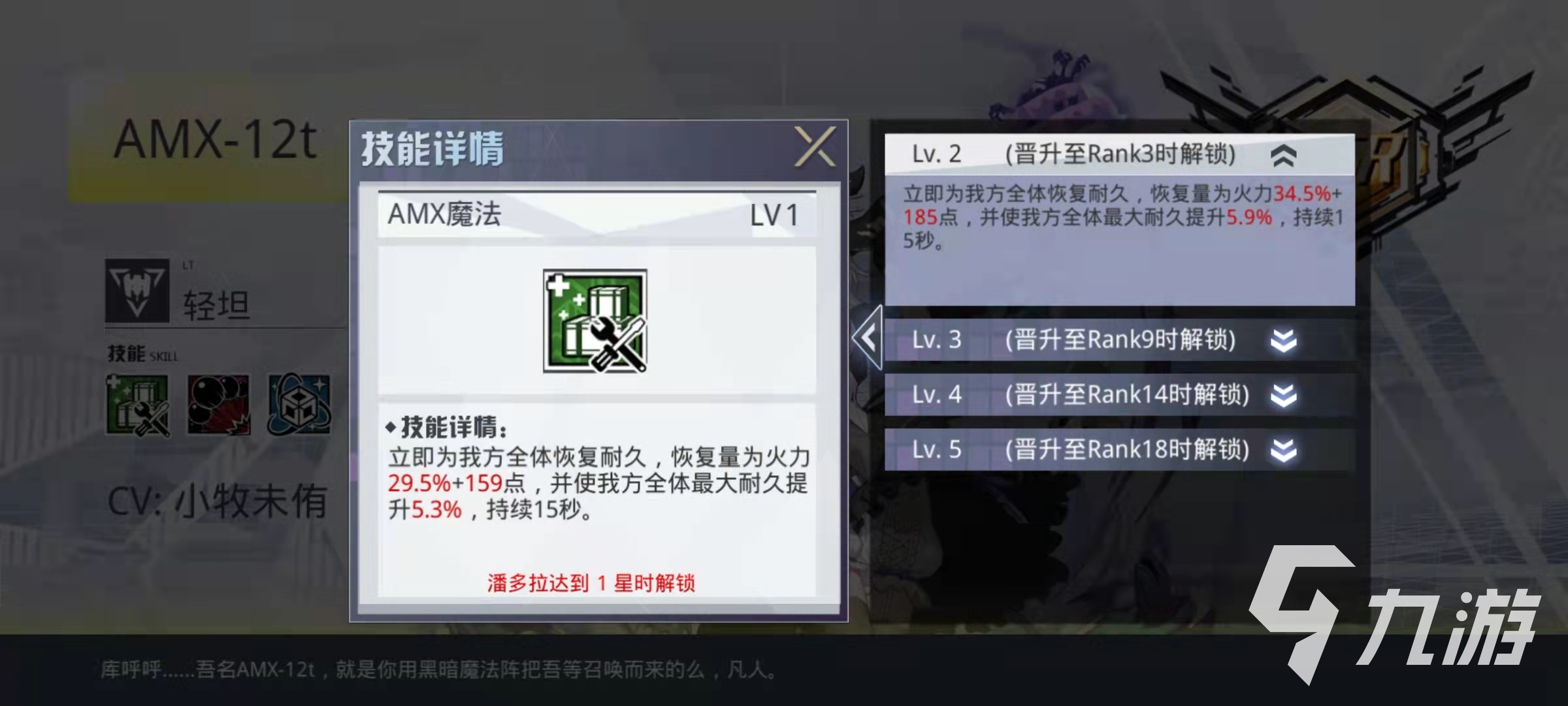 在輕型坦克中,小編給大家推薦的是AMX-12t這一款,AMX-12t也是一名SSR級別的角色,輕型坦克的特點是移動速度比較快,而且對方敵人數(shù)量越多,傷害就越高,所以適合前期戰(zhàn)斗。AMX-12t的主動技能AMX魔法,效果是釋放之后立即恢復己方所有角色的耐久值,在這里,耐久值就是生命值的意思,大家可以理解為回血。