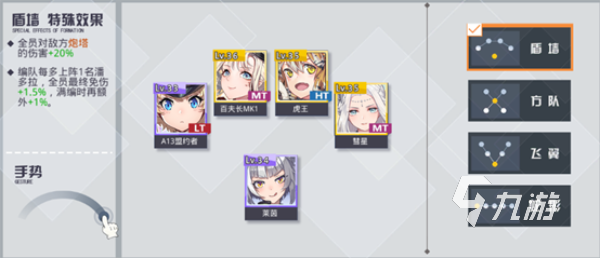 第三個(gè)就是飛翼了,飛翼這個(gè)陣型要累計(jì)角色的培養(yǎng)才可以解鎖。需要玩家將角色的總星級(jí)提升到三十這個(gè)階段才可以獲得,在前期的話還是有一定難度的,中期來(lái)進(jìn)行操作比較好。飛翼是一個(gè)突擊性陣型,隊(duì)長(zhǎng)在陣型的前方,可以獲得火力和耐久度的提升。這個(gè)陣型適合在敵人較多的時(shí)候使用,有不錯(cuò)的效率提升。