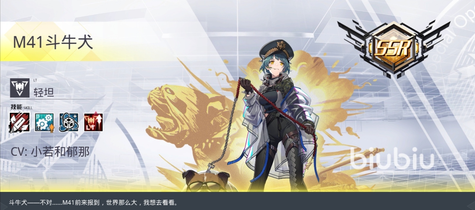 再有就是輕坦,在輕坦當(dāng)中小編最喜歡的SSR品質(zhì)的角色是M41斗牛犬,輕坦的優(yōu)勢正在靈活,攻擊速度快,在戰(zhàn)場上的使用也比較靈活,而這個M14斗牛犬。在眾多心坎中脫穎而出,就依賴于他較強(qiáng)的輸出能力。