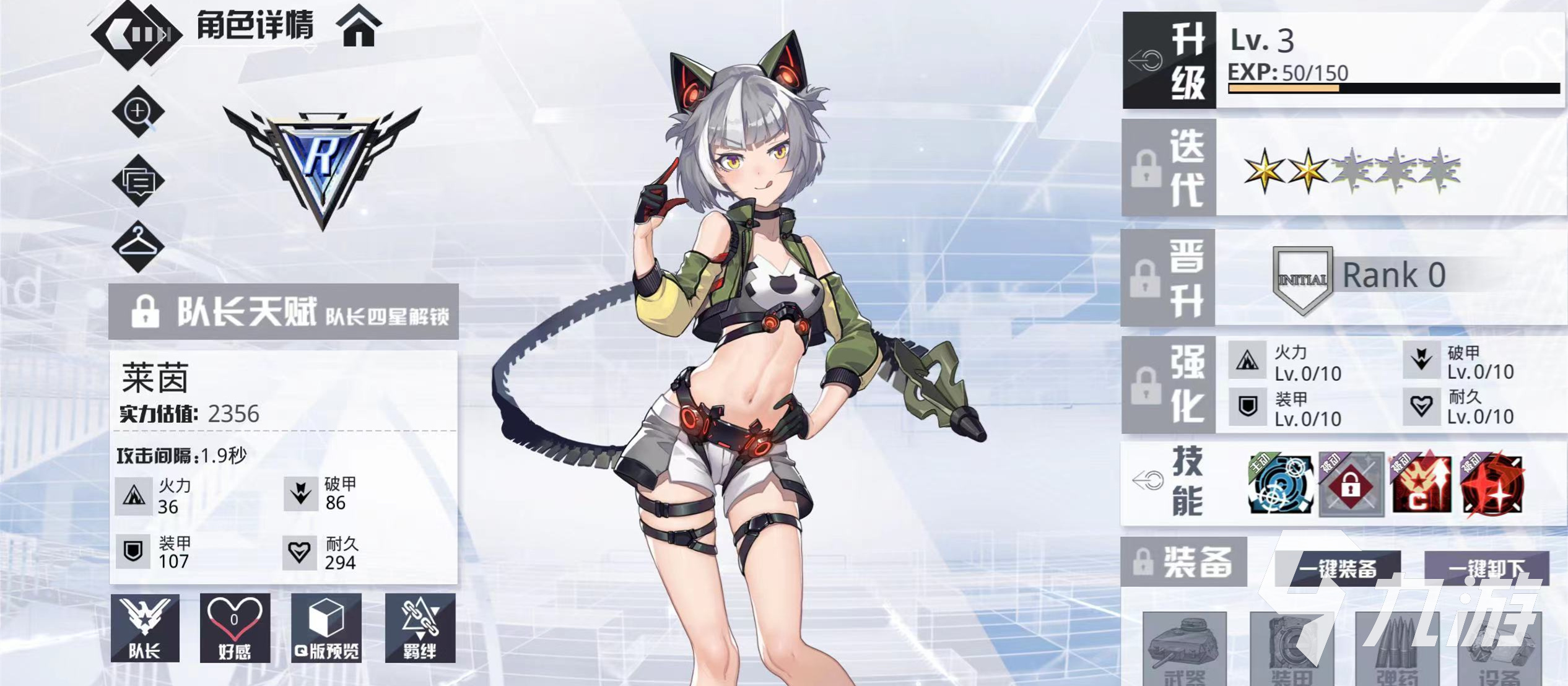 首先,小編想對(duì)玩家們所說(shuō)的就是R級(jí)萊茵是具備隊(duì)長(zhǎng)天賦的,隊(duì)長(zhǎng)是需要4顆星才可以解鎖使用,萊茵目前雖然是2顆星,但是這款人物角色還是很不錯(cuò)的,實(shí)力的基礎(chǔ)估值占2356,和很多R級(jí)角色相比不是很低,另外,萊茵的攻擊間隔只需要1點(diǎn)9秒,火力值,破甲,裝甲以及耐久力都還可以,都占了200多以上,滿(mǎn)級(jí)總共是150,玩家們可以給萊茵進(jìn)行一鍵裝備,可以同時(shí)裝備武器,彈藥,裝甲,設(shè)備等等。