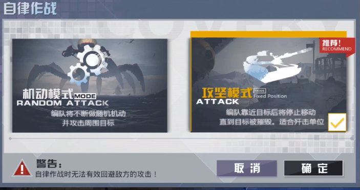 第二種模式是“攻堅模式”,這個模式在開啟之后編隊會自動的尋找目標(biāo),在找到目標(biāo)之后會會停止移動,同時記性全方位的火力輸出,直到范圍內(nèi)的敵人單位被殲滅位置。這個自律模式看起來就非常的不錯了,在有敵人的時候會停止移動,進行全力輸出,非常適合編隊中擁有殲擊車這個定位的角色來使用了,可以獲得額外的能力提升。