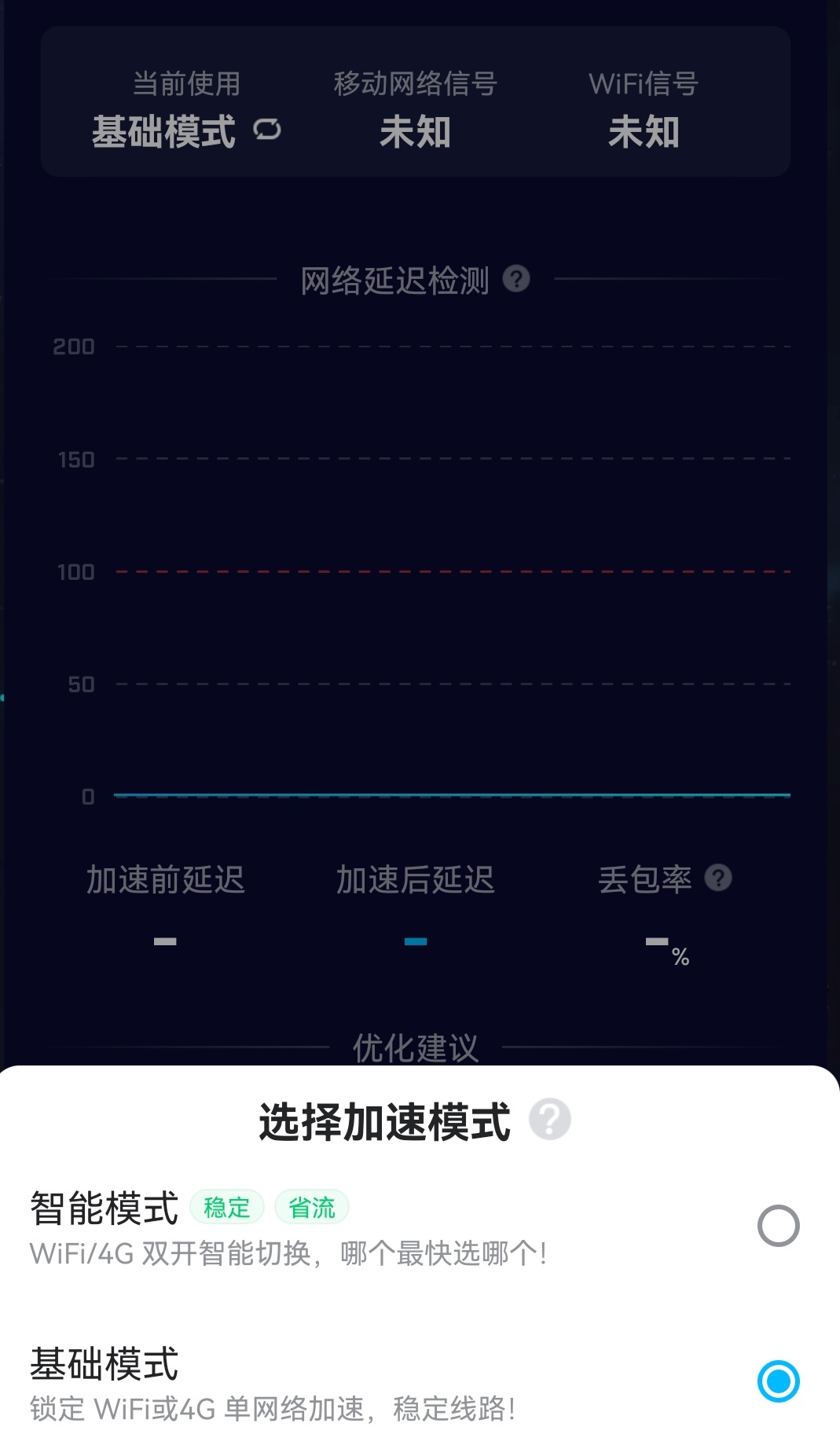 如果有需要還可以再加速界面更改加速類型,建議直接選擇智能模式,擁有非常好的加速效果。同時(shí)還能看到加速前后的延遲對(duì)比以及實(shí)時(shí)延遲的曲線等資料。