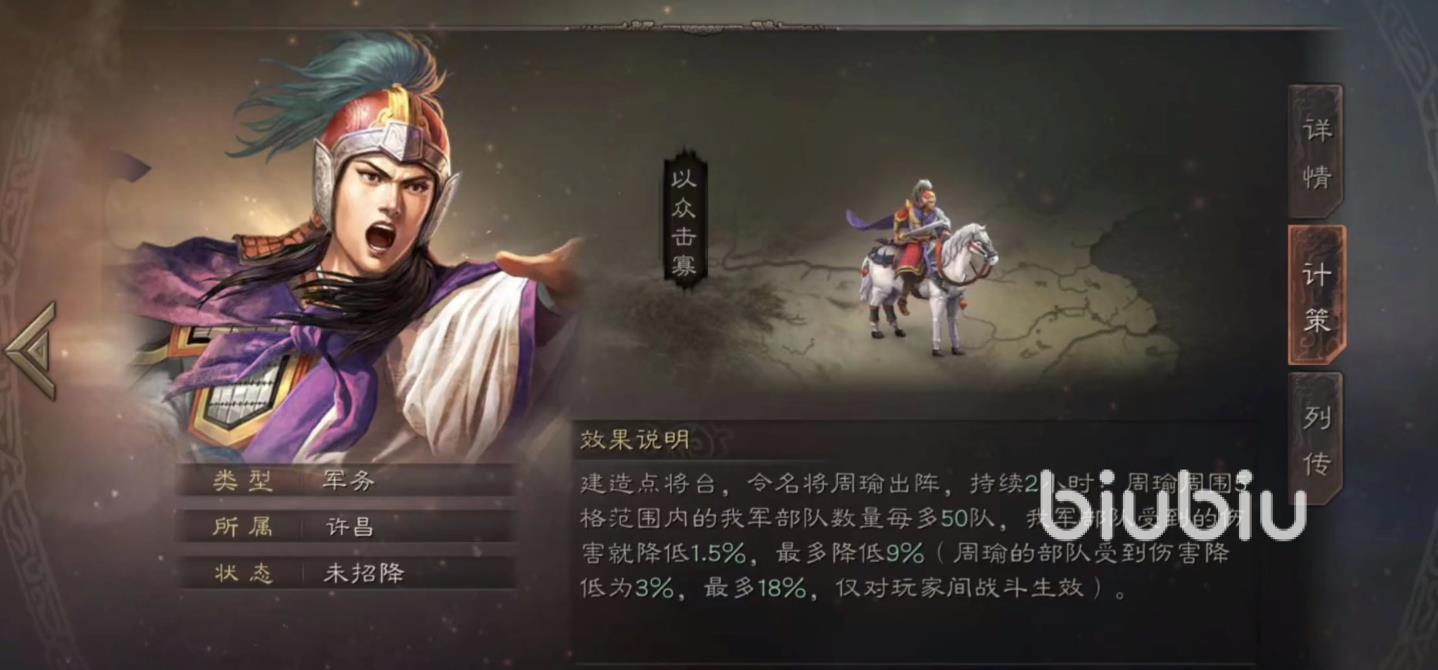 可能一些小伙伴們覺得百分之九的減傷buff有些平平無奇,不過在戰(zhàn)場上,并沒有那么的減傷戰(zhàn)法,而且其中一些是存在回合限制的,而相比較之下,周郎的這個新計策就顯得格外突出了,它的減傷buff是能夠持續(xù)八個回合,以及為三個武將來服務(wù)的。