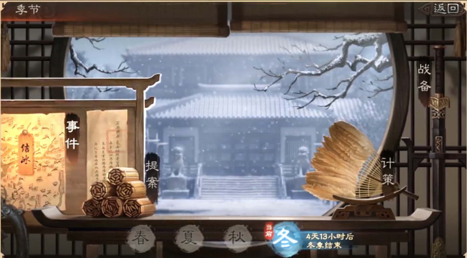 冬天的兩個(gè)計(jì)策效果分別為,在獲取襲營(yíng)的指令后,可以在準(zhǔn)備好后讓冰面周邊一定范圍中的主城進(jìn)入遭遇襲擊的狀態(tài),如果被己方軍隊(duì)占領(lǐng)后,可以直接拔城。還有一個(gè)是可以建陣,減少周邊一定范圍中的己方軍隊(duì)在建筑上戰(zhàn)斗時(shí)受到的傷害,還能夠調(diào)遣軍隊(duì)和征兵,但不能升級(jí)。