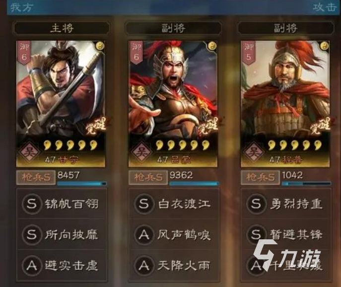 附:甘寧如果沒有所向披靡的話,也可以選擇騎虎難下;為呂蒙搭配沉沙決水+四面楚歌+誘敵深入的效果也很不錯(cuò)。
