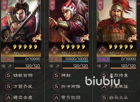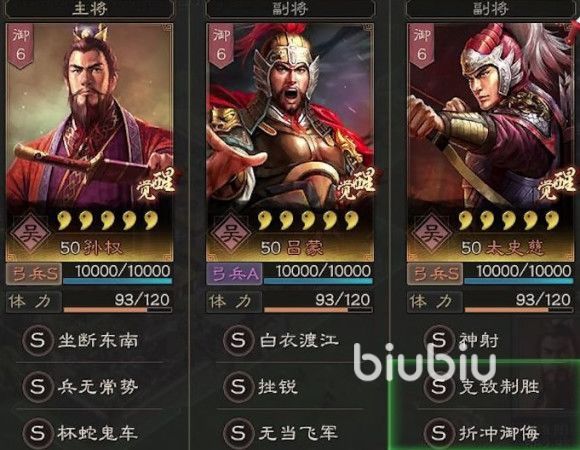 戰(zhàn)法的選擇上,小伙伴們可以為主將帶上奪魂以及杯蛇,而副將一個(gè)帶的是破陣以及披靡,另一個(gè)帶的則是八門以及白毦兵。這個(gè)隊(duì)伍堪稱S1最強(qiáng)的一個(gè)了,在前期的階段這三人基本上能夠做到帶領(lǐng)小伙伴們一直無腦沖,當(dāng)然時(shí)至今日的話,小伙伴們就要小心這個(gè)隊(duì)伍被吳弓克制了。
