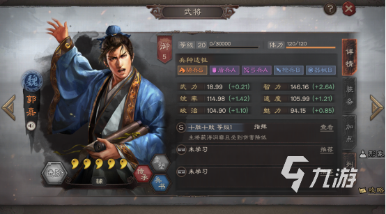 郭嘉:郭嘉主要負責給呂布提供洞察效果,避免被帶盛氣的敵人克制。戰(zhàn)法上就帶虎豹的兵種和三勢的陣法即可。