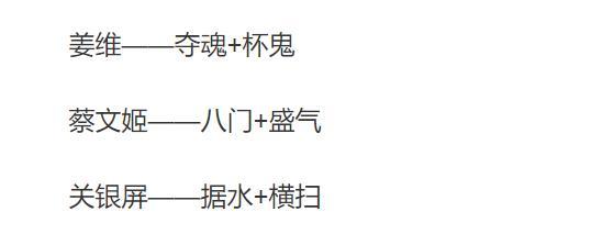 再一個(gè)就是蔡文姬的蜀騎隊(duì)了,蔡文姬她肯定是在隊(duì)伍里的,一同位列其中的還有姜維、以及關(guān)銀屏,具體配置如下: