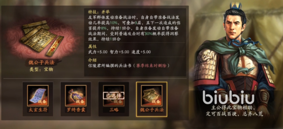 要知道的是這個魏公子兵法其實(shí)就是一件比較好用的道具,在自己的隊(duì)伍里有兩個及以上的武將佩戴準(zhǔn)備戰(zhàn)法的技能,其中一個使用此技能,就能夠?yàn)槟俏惶嵘俜种氖褂酶怕剩€會額外增加一些傷害,這樣可以更好的提升隊(duì)伍中的穩(wěn)定性。