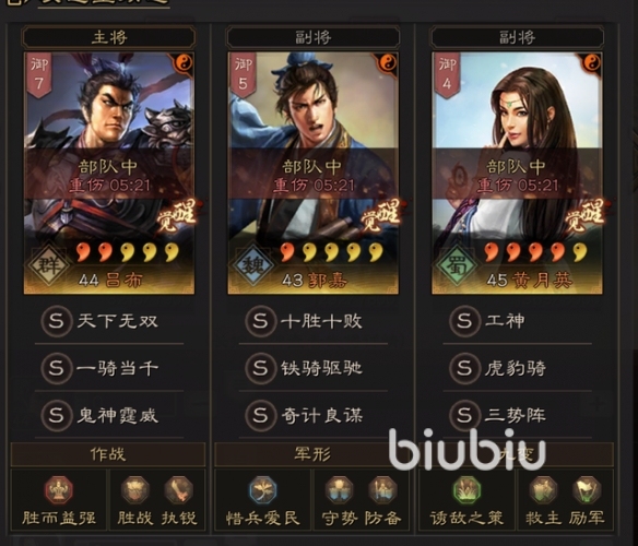 這個(gè)陣容搭配為,其中呂布推薦戰(zhàn)法“一騎當(dāng)千和鬼神霆威”兵書推薦使用“作戰(zhàn)和一鼓作氣、勝戰(zhàn)”。郭嘉推薦戰(zhàn)法為“三勢(shì)陣和橫戈躍馬”,推薦的兵書為“九變和救主、誘敵之策”。而黃月英的戰(zhàn)法推薦“虎豹騎和鐵騎驅(qū)馳”,兵書使用“臨危不亂和勵(lì)軍、掩虛”。