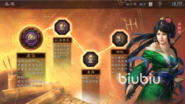 關(guān)銀屏:二十級前帶橫掃,打出高額的AOE傷害。二十級后帶據(jù)水。關(guān)銀屏發(fā)動率還是很高的,因此輸出非常穩(wěn)定,但加點需要加速度,保證能夠先手打出虎嗔效果,這樣才能配合樂進打出震懾效果。