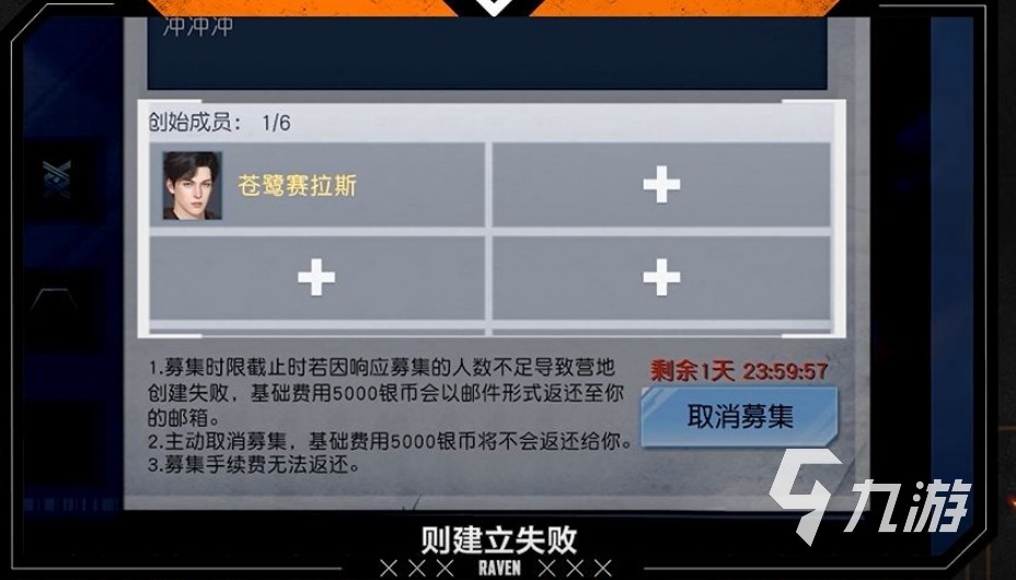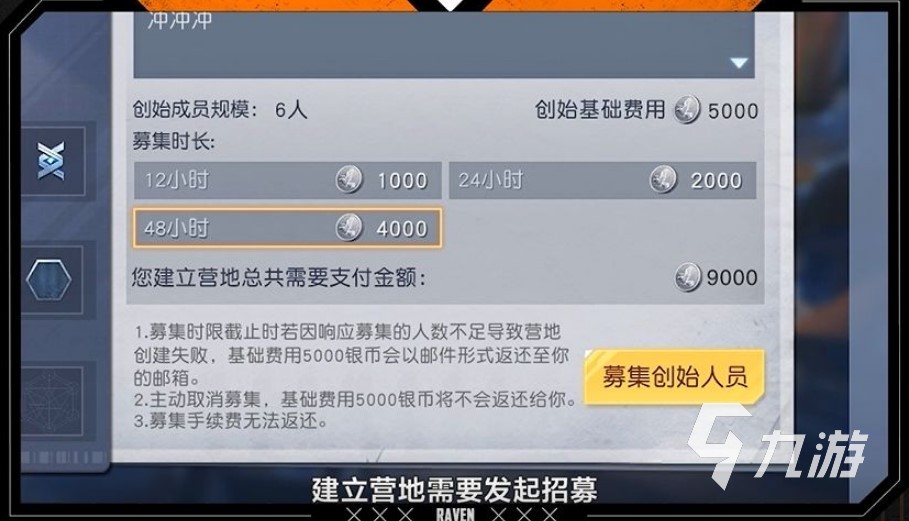 框?qū)⒏嬖V你想要創(chuàng)建營地必須將交付五千金幣,然后再召集六個隊友才可以建立,如果在規(guī)定時間內(nèi)沒有召集到,那則算營地建造失敗,建造失敗不會退還傭金。