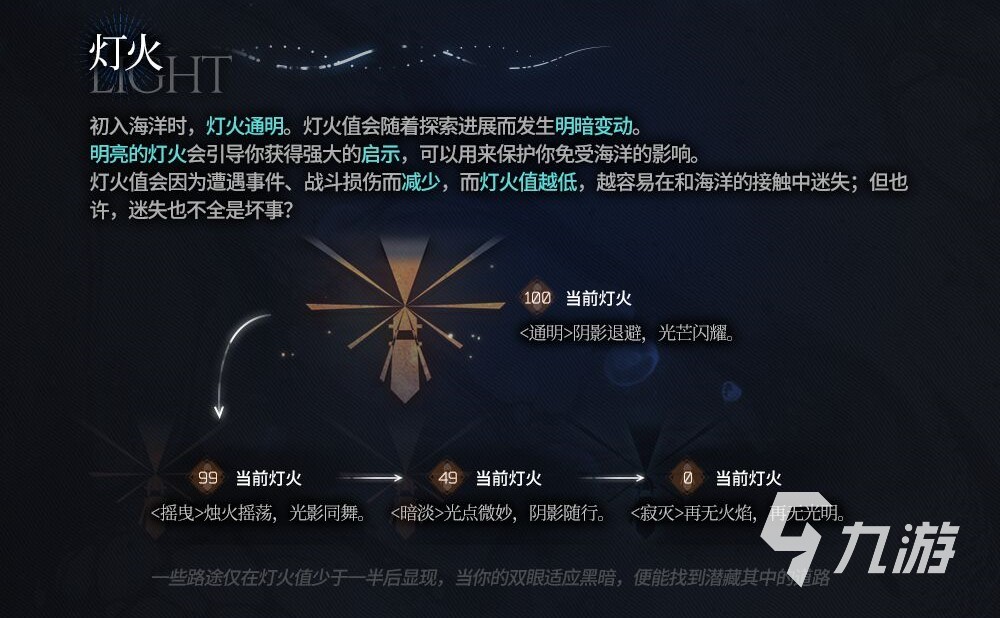 類比可以理解為SAN值系統(tǒng),在任務(wù)開始時會以滿值開始,在探索途中根據(jù)遇到的不同事件或戰(zhàn)斗時受到損傷都會使燈火值不斷降低,不同的燈火值應(yīng)該會使以后能夠遇到的事件有所不同。