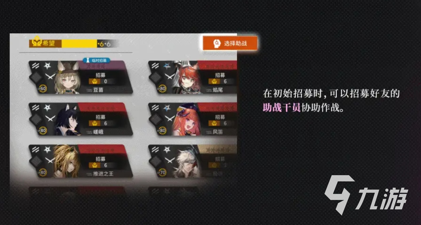 在初始招募時(shí),可以招募好友的助戰(zhàn)干員協(xié)助作戰(zhàn);還會(huì)出現(xiàn)隨機(jī)的“臨時(shí)招募”干員,這些干員的等級(jí)不受現(xiàn)有已擁有干員的影響,首次招募不消耗希望,在進(jìn)階后是最高等級(jí);臨時(shí)招募的情況下,還有機(jī)會(huì)遇到來自羅德島的精英干員。