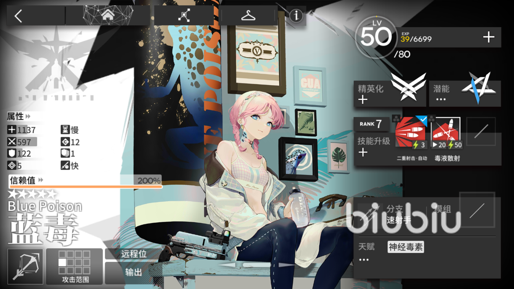 最后是狙擊干員,五星狙擊強勢的干員不多,干員藍毒算是其中一個特例。藍毒的散射攻擊在面對無人機群時可以起到快速清怪的效果,她的被動的毒液法傷也是前期不錯的破盾輸出,效果拔群。