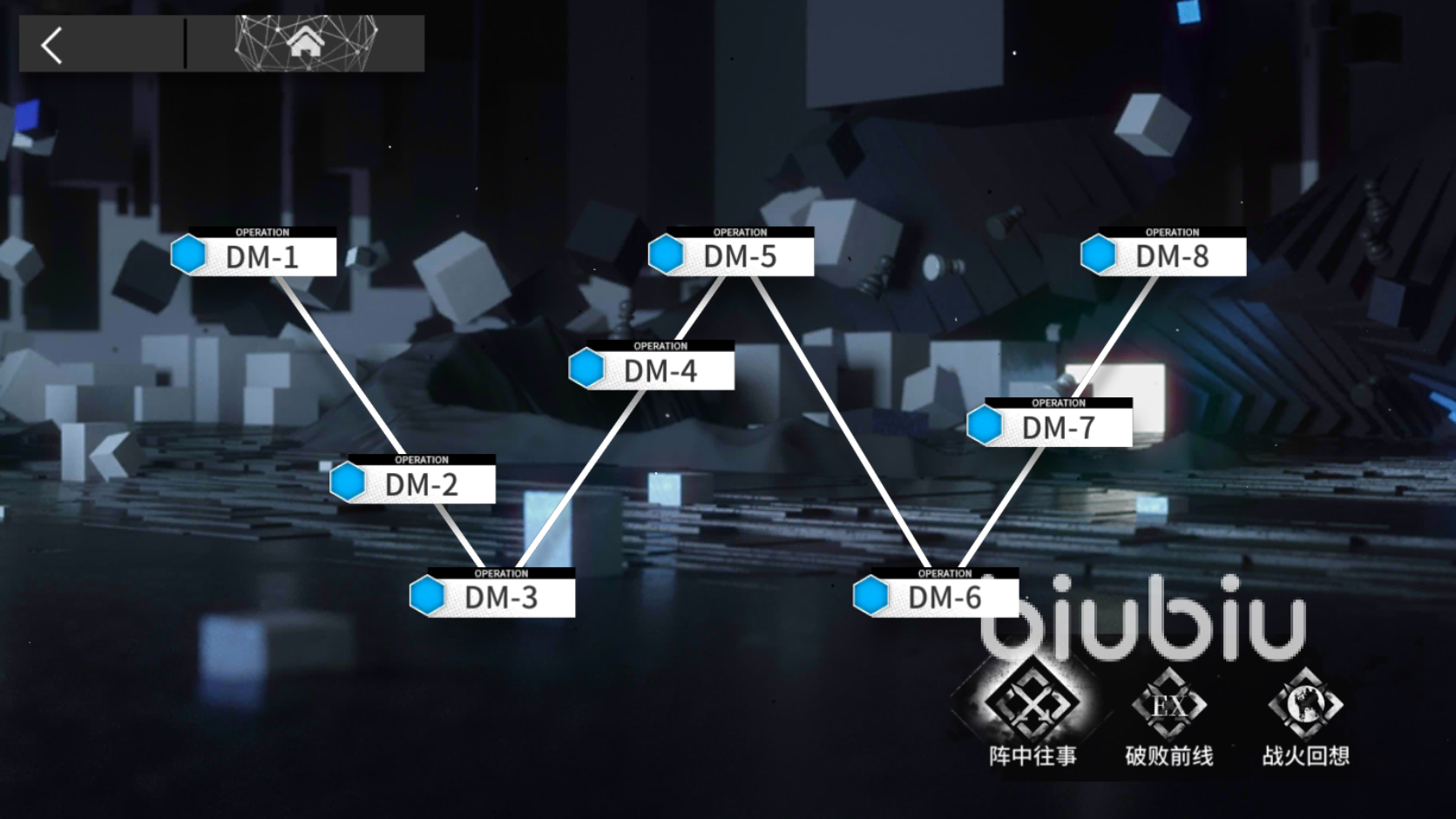 在生于黑夜關卡的主界面我們可以看到,該系列關卡一共分為“陣中往事”,“破敗前線”和“戰(zhàn)火回想”三個部分,其中戰(zhàn)火回想就是我們需要解鎖的dmmo1關卡。